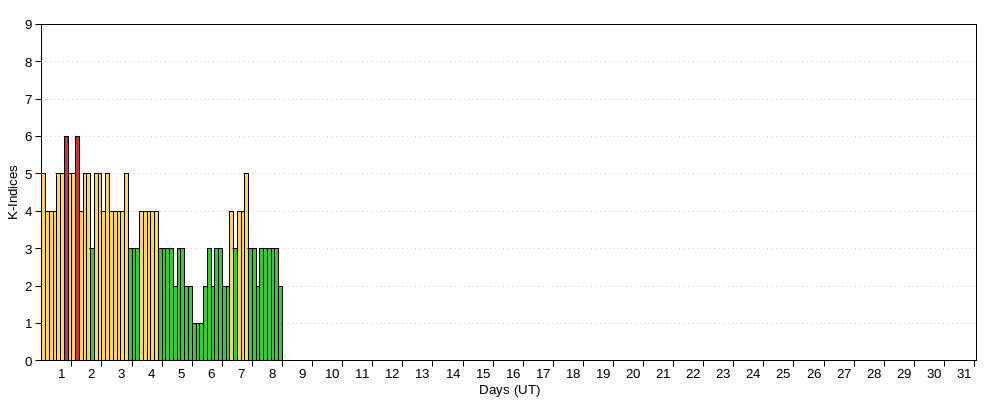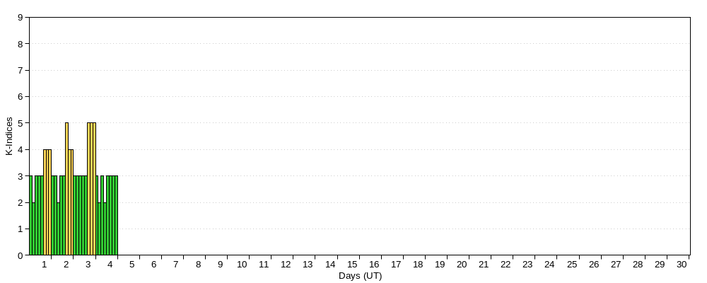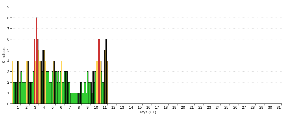 The K-index, presented on these pages, is calculated by the J. Bartels algorithm. The raw data are coming from the fluxgate magnetometer, operating in Borok Geophysical observatory. The quiet-day curve of magnetic field is calculated as median averages from quiet days for each month. The deviations are converted using a semi logarithmic table created by J. Bartels, in to 3 hour K indices. The K-index is calculated from the more disturbed component (X or Y).