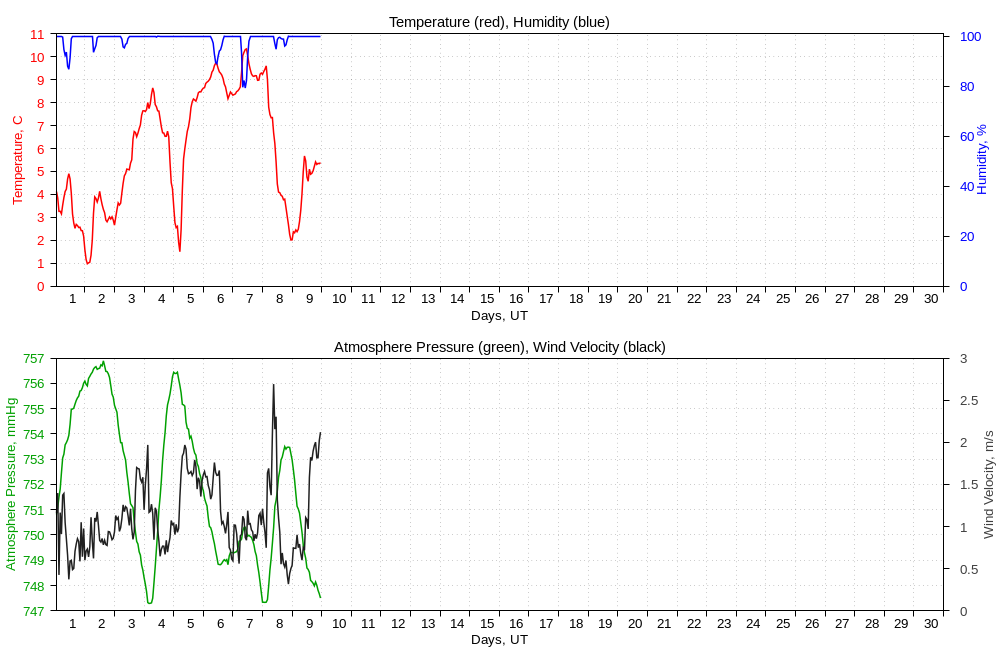 The meteorological data are provided by weather station AMK-03 (WS-2800 for data before April, 2019, WS-2500 for data before June, 2018) and are averaged by one hour time period.